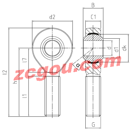 | type | right hand thread | left hand thread | d (mm) | G | B (mm) | C1 (mm) | h (mm) | d1 (mm) | d2 (mm) | dk (mm) | l1 (mm) | l2 (mm) | l7 (mm) | tilt angle alpha (°) | weight (kg) | basic load rating dyn C (kN) | basic load rating stat Co (kN) | radial clearance CN (m) | d (mm) |