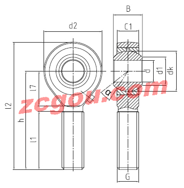 | type | right hand thread | left hand thread | d (mm) | G | B (mm) | C1 (mm) | h (mm) | d1 (mm) | d2 (mm) | dk (mm) | l1 (mm) | l2 (mm) | l7 (mm) | tilt angle alpha (°) | weight (kg) | basic load rating dyn C (kN) | basic load rating stat Co (kN) | radial clearance CN (m) | d (mm) |
