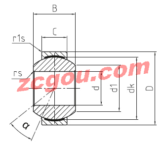 | type | d (mm) | d1 (mm) | D (mm) | dk (mm) | B (mm) | C (mm) | rs (mm) | rs1 (mm) | tilt angle alpha (°) | weight (kg) | basic load rating dyn C (kN) | basic load rating stat Co (kN) | radial clearance CN (m) | d (mm) |
