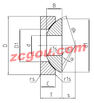 | type | d (mm) | d1 (mm) | dk (mm) | d2 (mm) | D (mm) | D1 (mm) | B (mm) | C (mm) | S (mm) | T (mm) | rs (mm) | rs1 (mm) | tilt angle alpha (°) | weight (kg) | basic load rating dyn C (kN) | basic load rating stat Co (kN) | d (mm) |