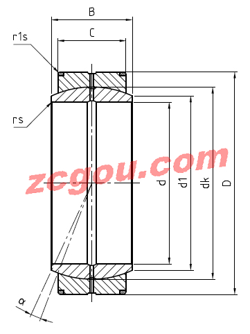 | Article number | d (mm) | d1 (mm) | D (mm) | dk (mm) | B (mm) | C (mm) | rs (mm) | rs1 (mm) | tilt angle alpha (°) | weight (kg) | basic load rating static Co (kN) | basic load rating dynamic C (kN) | radial clearance CN (μm) |