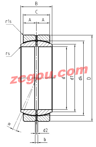 | Article number | d (mm) | d1 (mm) | D (mm) | dk (mm) | B (mm) | C (mm) | rs (mm) | rs1 (mm) | tilt angle alpha (°) | weight (kg) | basic load rating static Co (kN) | basic load rating dynamic C (kN) | radial clearance CN (μm) | A (mm) | b (mm) | d2 (mm) | d2 quantity |