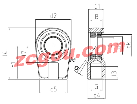 | type | d (mm) | d1 (mm) | d2 (mm) | d4 (mm) | d5 (mm) | dk (mm) | G | B (mm) | C1 (mm) | l3 (mm) | l7 (mm) | l4 (mm) | h1 (mm) | tilt angle alpha (°) | weight (kg) | basic load rating dyn C (kN) | basic load rating stat Co (kN) | radial clearance CN (m) | d (mm) |