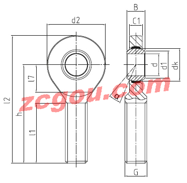 | type | right hand thread | left hand thread | d (mm) | G | B (mm) | C1 (mm) | h (mm) | d1 (mm) | d2 (mm) | dk (mm) | l1 (mm) | l2 (mm) | l7 (mm) | tilt angle alpha (°) | weight (kg) | basic load rating dyn C (kN) | basic load rating stat Co (kN) | radial clearance CN (m) | d (mm) |
