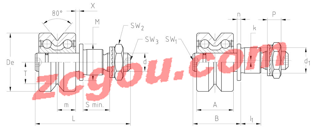 | Ordernumber | Type | De | d1 | d | T | m | s min | P | L | A | B | l1 | M | n | X | SW1 | SW2 | SW3 | k |