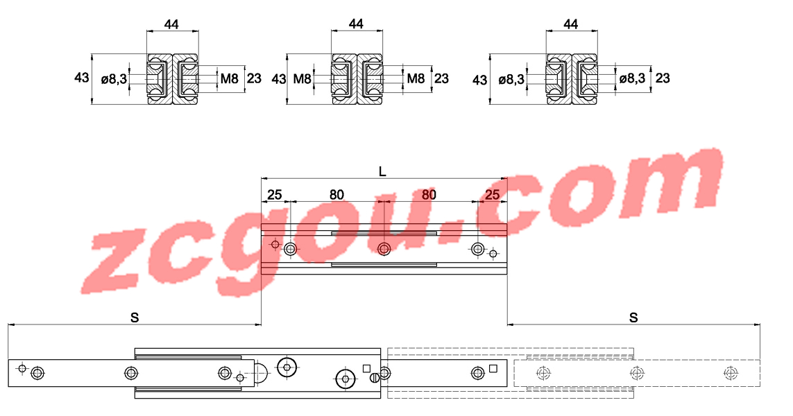 | Guide LSE 43 | L (mm) | S (mm) | Cy (N) | Cz (N) | Cdyn (N) | Deflection (mm) | Mass (kg) |