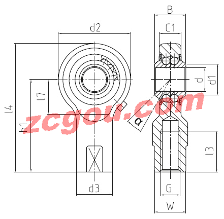 | type | right hand thread | left hand thread | d (mm) | G | B (mm) | C1 (mm) | h1 (mm) | d1 (mm) | d2 (mm) | d3 (mm) | l3 (mm) | l7 (mm) | W (mm) | tilt angle alpha (°) | weight (kg) | rotational speed limit n max. (min-1) | axial factor Y | axial factor Y0 | basic load rating dyn C (kN) | basic load rating stat Co (kN) | radial clearance CN (m) | d (mm) |