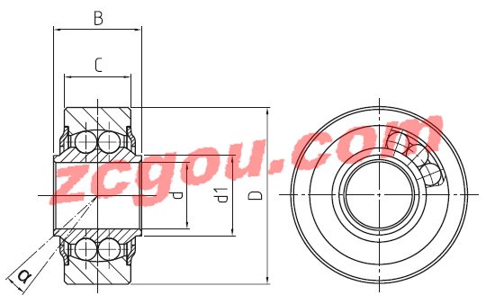 | Type | Type (version with circular lubrication groove and lubrication hole for relubrication) | d (mm) | D (mm) | B (mm) | C (mm) | d1 (mm) | tilt angle alpha (°) | Gewicht (kg) | rotational speed limit n max. (min-1) | axial factor Y | axial factor Y0 | basic load rating dyn C (kN) | basic load rating stat Co (kN) | radial clearance CN (m) | d (mm) |