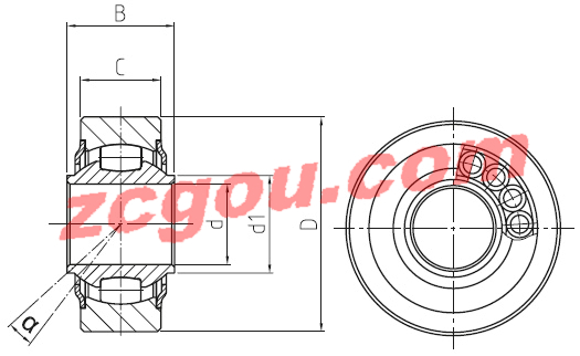 | type | d (mm) | D (mm) | B (mm) | C (mm) | d1 (mm) | tilt angle alpha (°) | Gewicht (kg) | rotational speed limit n max. (min-1) | basic load rating dyn C (kN) | basic load rating stat Co (kN) | radial clearance CN (m) | d (mm) |